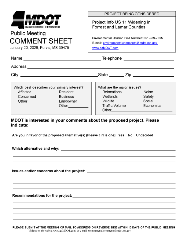 Thank you for participating in this Public Involvement Meeting. Comments on this project can be submitted in several ways, including but not limited to mail, email, and the online form.